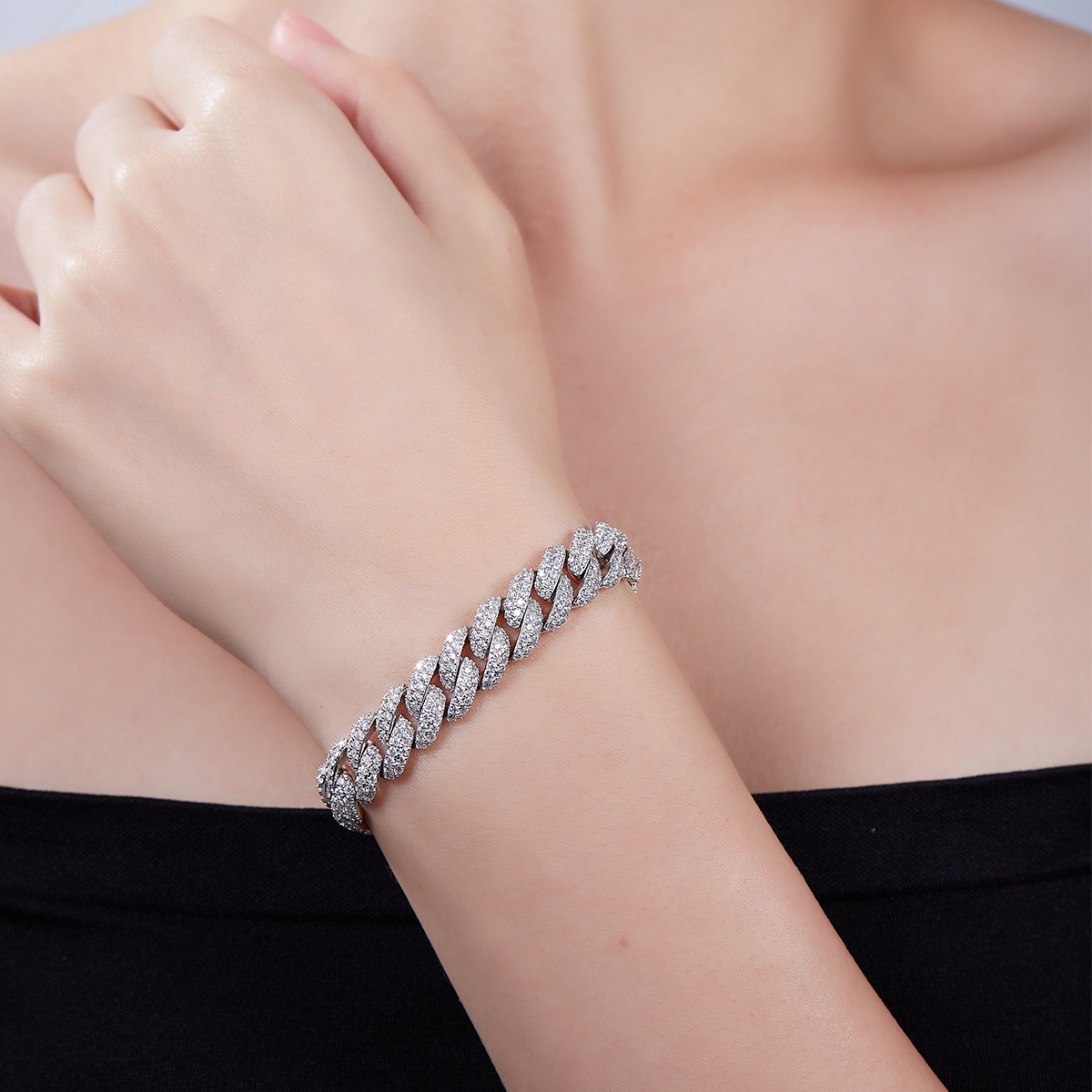 10mm Wide Cuban Chain S925 Silver with Moissan Diamonds Criolite Round White DVVS