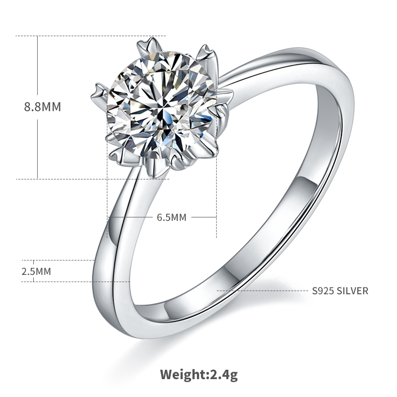 Straight Arm Classic Snowflake S925 Silver Plated White Gold Moissan Diamond Women's Ring 1 Ct D