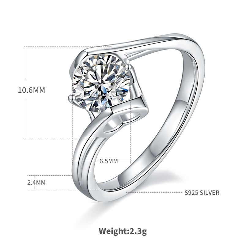 Twisted Arm Classic Angel's Kiss S925 Silver Plated White Gold Moissan Diamond Women's Ring 1 Carat Grade D